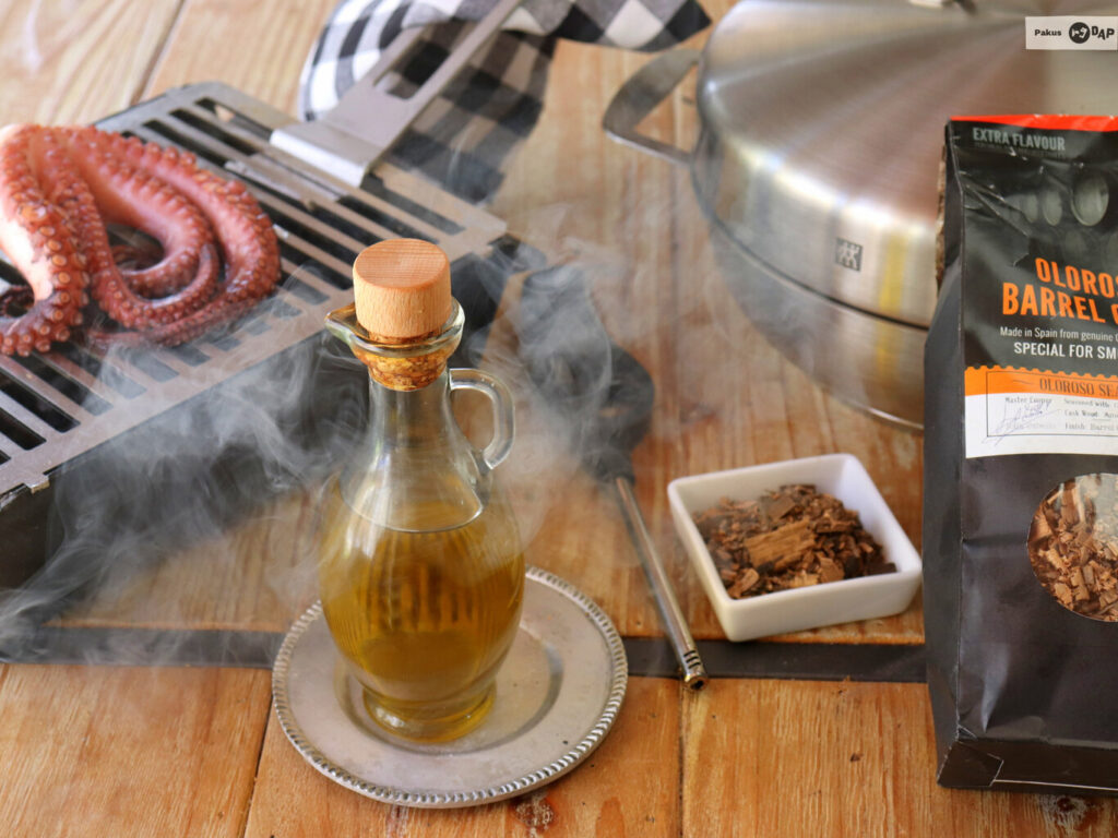 Una vez generado el humo, coloca el recipiente con el aceite (virgen extra, girasol, o el que prefieras) sobre el ahumador, asegurándote de que el humo lo envuelva de forma uniforme. Deja que el aceite se ahúme durante 15 a 20 minutos, removiendo suavemente cada cierto tiempo para que el aroma se distribuya bien y para supervisar el proceso. El aroma intenso a humo indicará que el proceso está funcionando correctamente. Si utilizas pastillas, vigila la combustión para controlar la intensidad del humo.